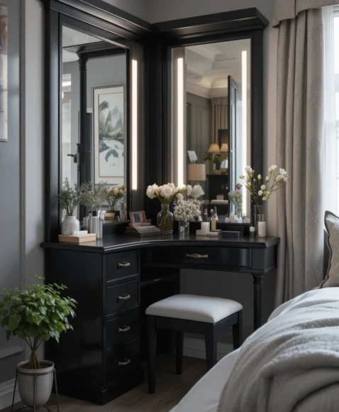 Here are 18 black makeup vanity ideas that elevate your bedroom or dressing area with style and practicality.