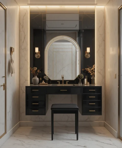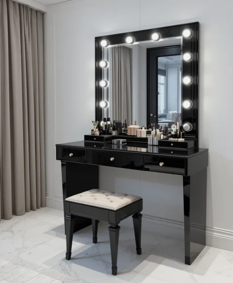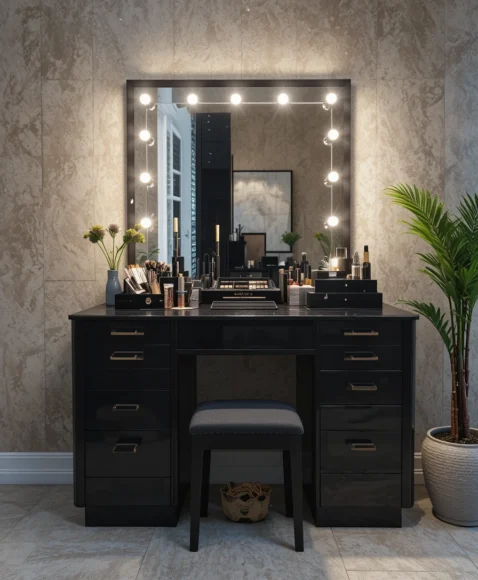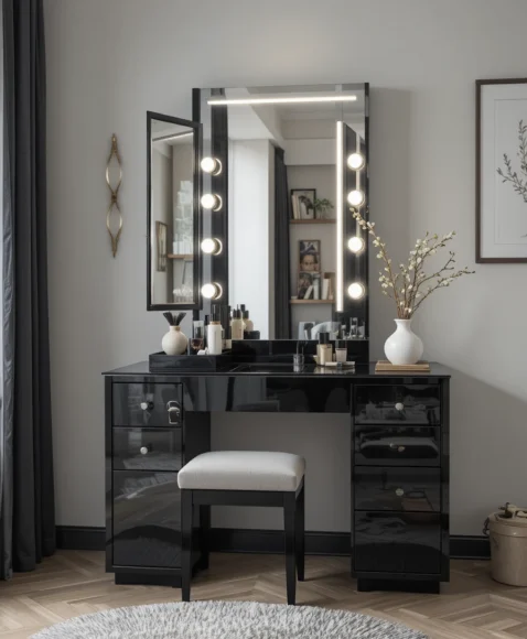 A glossy black vanity paired with a glass top reflects light beautifully. It’s elegant, practical, and easy to clean, making your beauty area feel luxurious and organized.