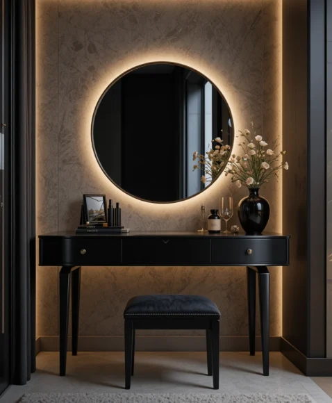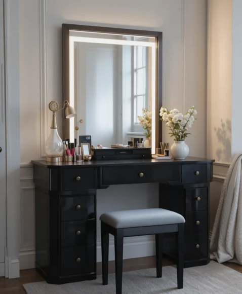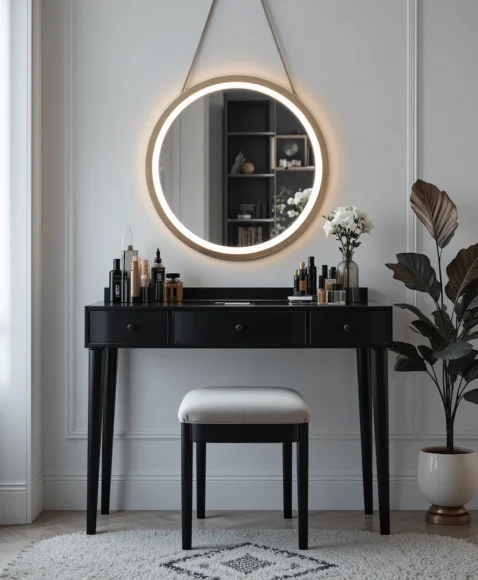 Combine a black wooden or lacquered vanity with an LED-framed mirror. It’s functional for makeup application while adding a modern, chic vibe to the room.