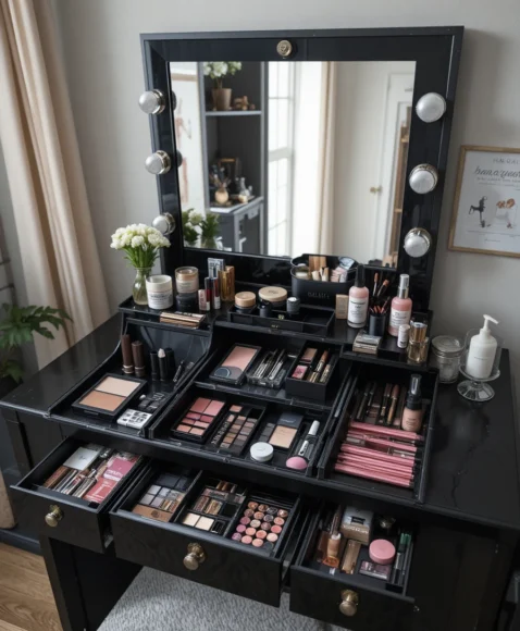 Multi-level drawers keep makeup organized and accessible. Different compartments for palettes, brushes, and skincare products make a black vanity practical while looking sleek and modern.