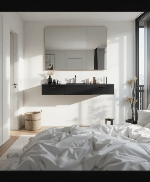 A floating black vanity with gold accents is perfect for modern interiors. Sleek drawers, minimal hardware, and clean lines create a stylish, space-saving beauty corner.