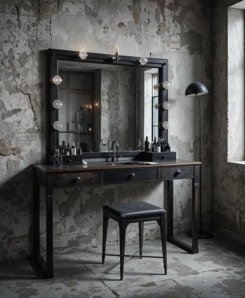 Industrial designs blend black metal frames with dark wood surfaces. Exposed hardware and clean geometric shapes give your vanity an edgy, modern look that works perfectly in loft-style interiors.