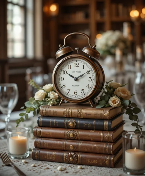 Place a small vintage clock on top of the books to symbolize timeless love. This idea works beautifully for classic or vintage-themed weddings.