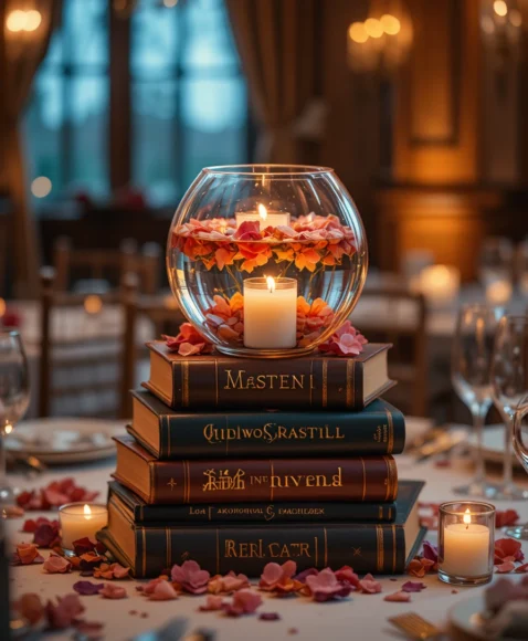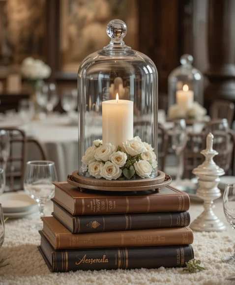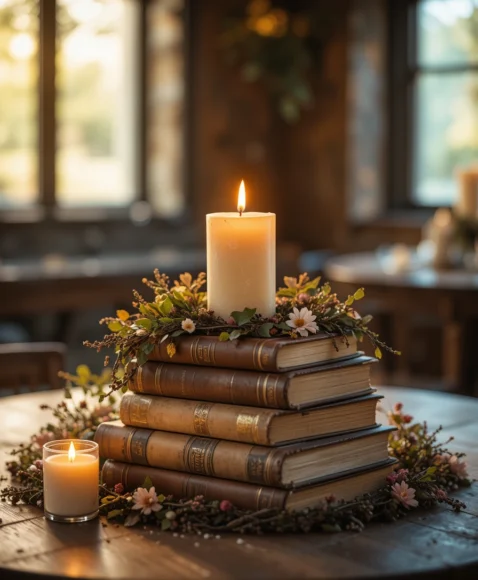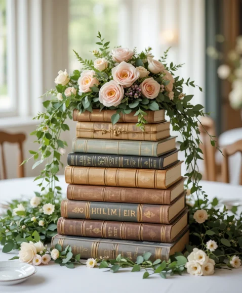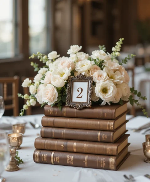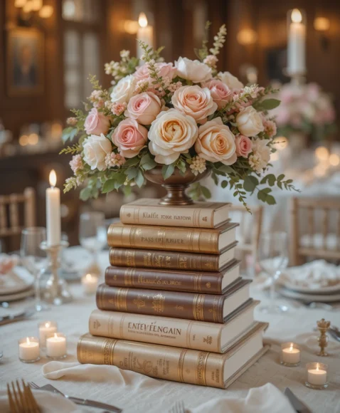Using books as centerpieces allows couples to create a warm, vintage-inspired atmosphere while also adding unique textures and layers to table décor.