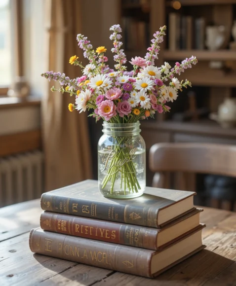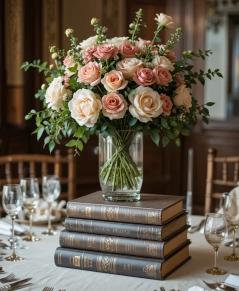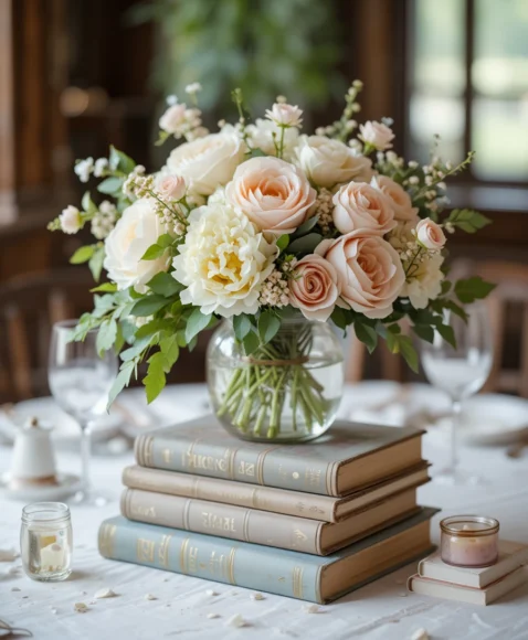 Create a romantic table display by placing a clear glass vase filled with soft blooms on top of stacked books. Flowers like roses, peonies, or hydrangeas add elegance while the aged book covers create a beautiful vintage backdrop.