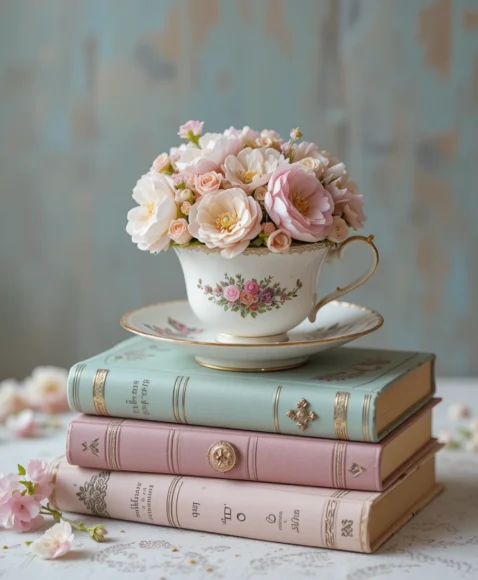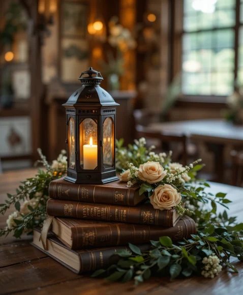 By pairing books with flowers, candles, lace, lanterns, or decorative accents, you can create beautiful arrangements that feel like they came straight out of a romantic story.