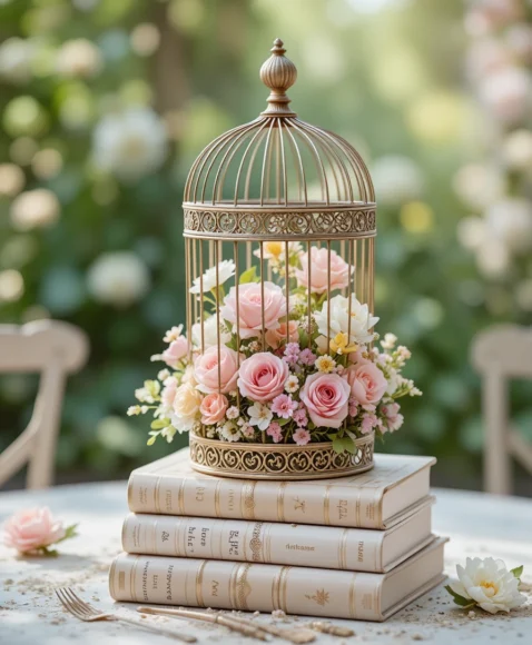 Position a decorative birdcage filled with flowers or candles on a stack of books. The layered arrangement adds height and a romantic garden feel.