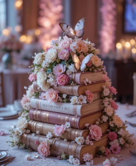 Books symbolize stories, memories, and timeless love, making them a perfect decorative element for wedding tables.