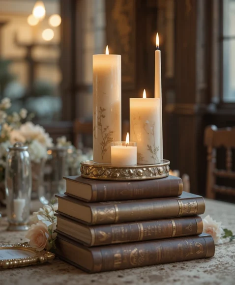 Stack a few books and place a tall pillar candle or elegant taper candle on top. The soft glow of candlelight reflecting off the textured pages creates a warm and intimate wedding atmosphere.