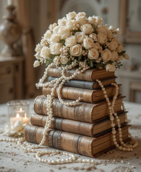 Drape strings of pearls across the stacked books for a glamorous vintage look. The soft shine of pearls adds a touch of elegance to the table décor.