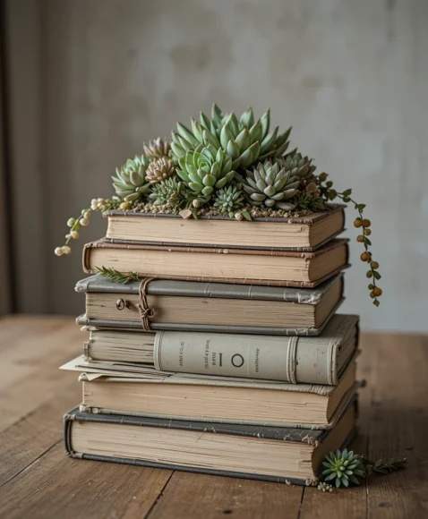 Place small succulent plants on top of stacked books for a modern yet natural centerpiece. The greenery adds fresh contrast against the aged book pages.