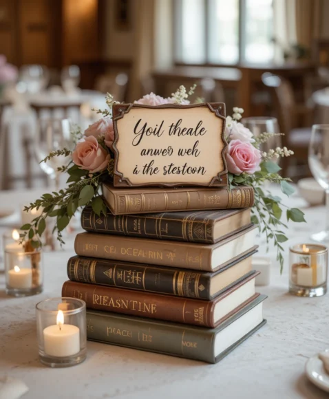 Books symbolize knowledge, love stories, and timeless moments, making them a perfect decorative element for wedding tables.