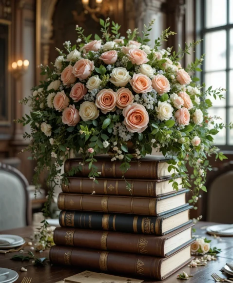 Stack several books and top them with a lush bouquet of cascading flowers. The arrangement spills slightly over the sides, creating a dramatic and luxurious centerpiece perfect for elegant weddings.