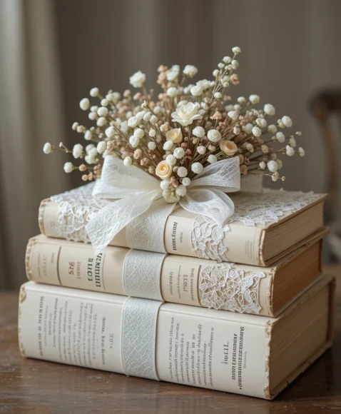 Wrap delicate lace ribbon around a stack of vintage books to give the centerpiece a romantic and elegant look. Add a small bouquet of baby’s breath or dried flowers to complete the timeless wedding aesthetic.