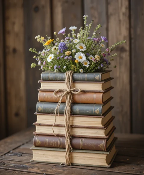 Stack three or four vintage books in different sizes to create a charming base for the centerpiece. Place them neatly in descending order so the largest book sits at the bottom. A small floral arrangement placed on top adds softness and romantic color to the table setting.