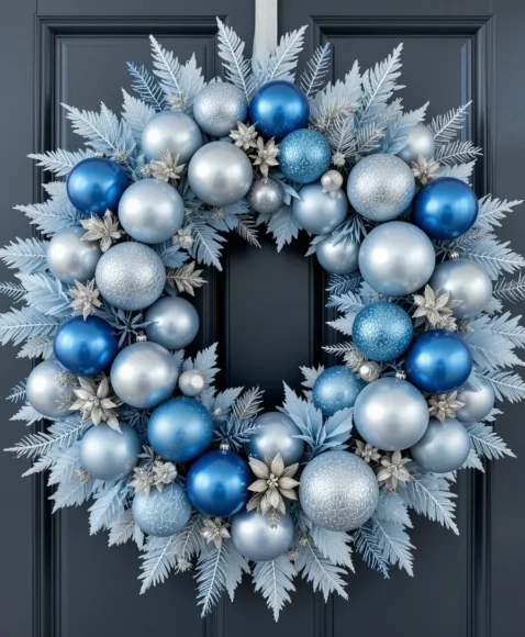 Mix icy blue ornaments with silver accents for a frosty, sophisticated wreath. This color palette feels fresh and gives a modern twist to traditional Christmas décor.