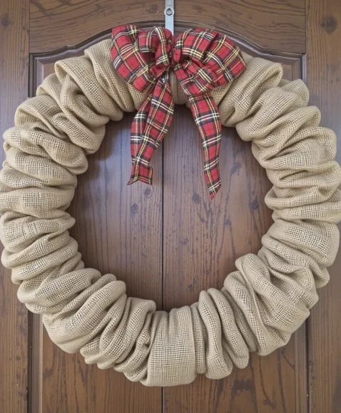 Wrap burlap around a wreath frame and accent it with plaid or metallic ribbons. This rustic yet chic idea works perfectly for farmhouse-inspired holiday décor.