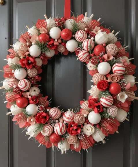 Create a fun, playful design by alternating red and white elements in a striped pattern. This candy cane-inspired wreath is especially appealing for families with kids.