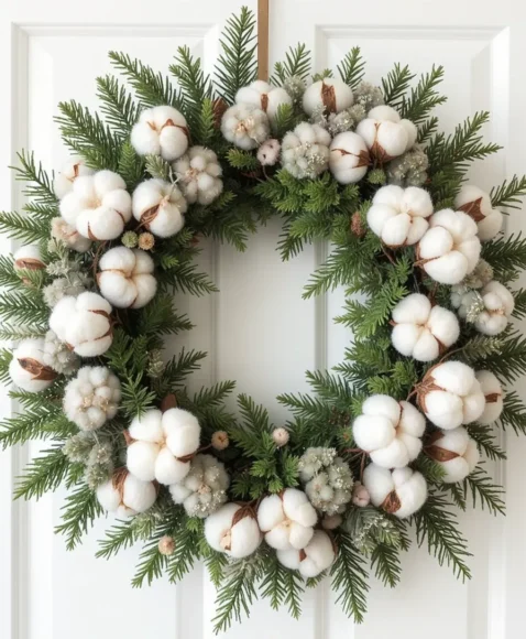 Mix cotton stems with evergreen sprigs for a cozy farmhouse-inspired look. The fluffy cotton adds softness, making this wreath both rustic and inviting.
