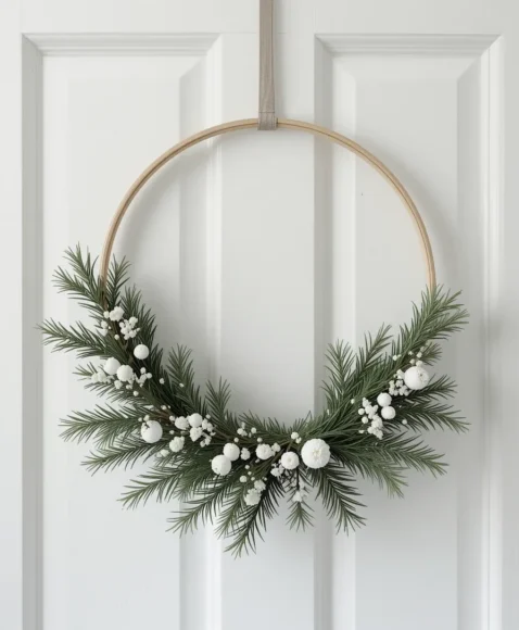 Go simple with a thin hoop wreath decorated with just a few pine sprigs and white accents. This minimalist design feels modern, clean, and stylish.