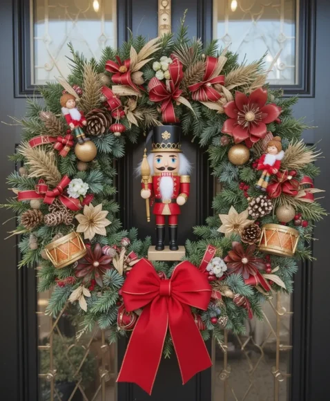 Incorporate mini nutcracker figures, drums, and bold red ribbons for a unique design. This playful wreath idea celebrates a beloved holiday tradition.