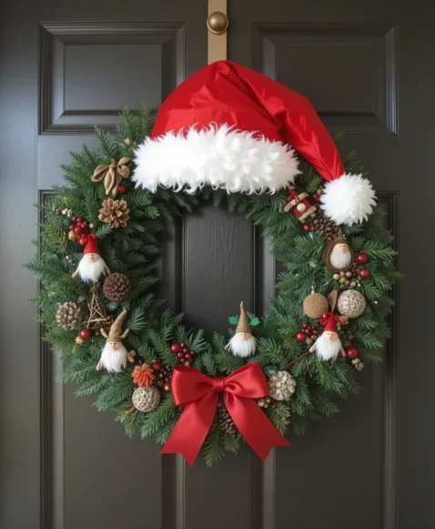 Add a Santa hat, small figurines, or red-and-white accents to your wreath. This design is festive, fun, and sure to bring smiles to kids and guests alike.