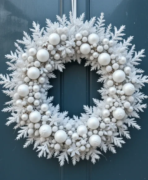 Choose a wreath made of frosted branches, white ornaments, or snowflake shapes. Its crisp, icy design adds elegance and a magical winter wonderland vibe.