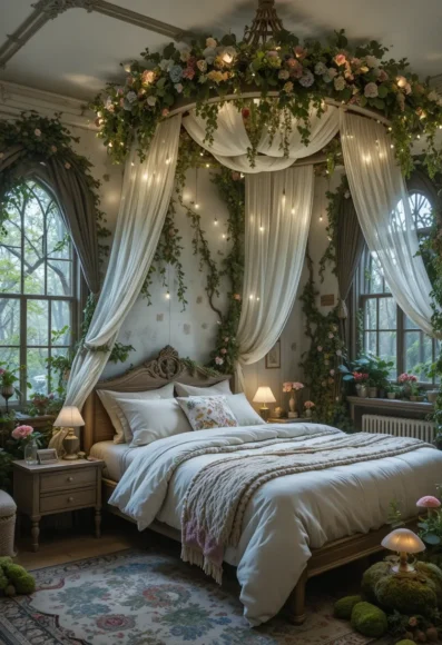 A canopy bed frame with wood or wrought iron elements can resemble tree branches. Drape soft green or white fabric over the frame to evoke the feeling of sleeping under a forest canopy.