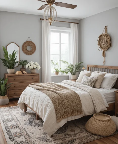 Grey walls provide a calm and neutral backdrop that works beautifully with boho elements. Light grey tones help the room feel open and airy while allowing textured décor to stand out.