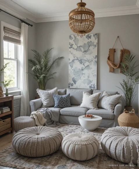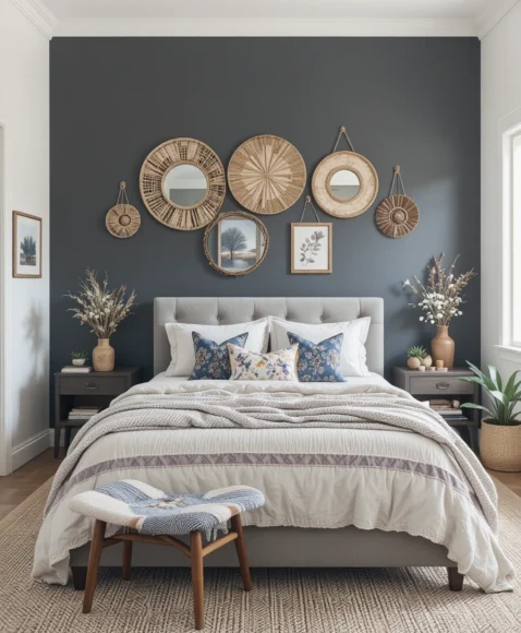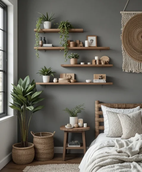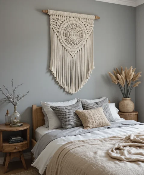 Adding macramé wall hangings, woven baskets, and natural wood frames creates a layered look that feels cozy and artistic. The contrast between smooth grey walls and textured boho décor makes the room visually interesting and inviting.