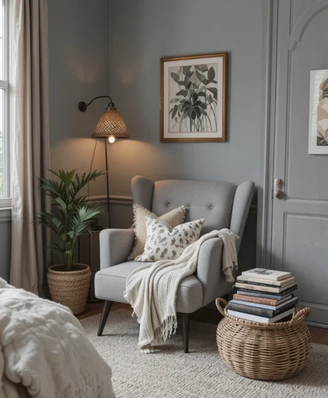 Add a grey throw blanket and a woven basket for books to create a comfortable and peaceful reading space within your bedroom.