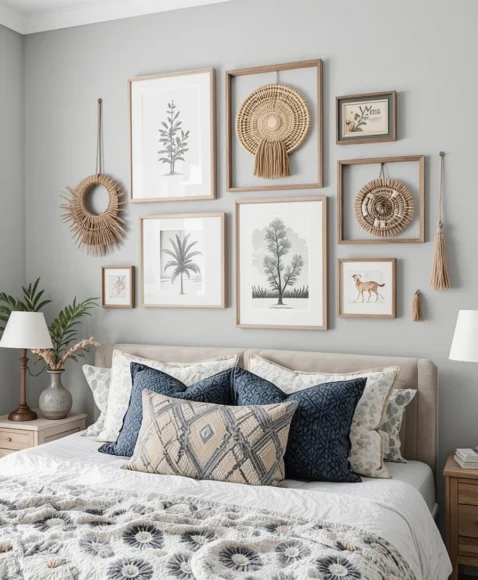 A gallery wall filled with art prints, woven décor, and framed photos can bring personality to a bedroom.