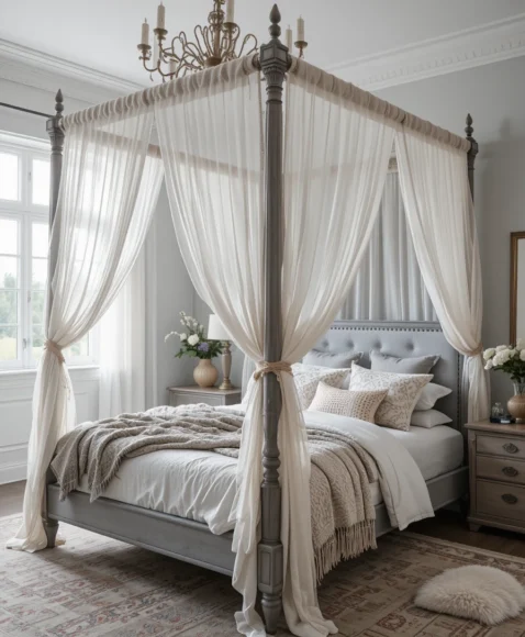 A canopy bed adds elegance and softness to a bedroom. Using sheer or light boho-style curtains around a grey canopy frame creates a dreamy and relaxing atmosphere.