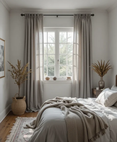 Linen curtains in soft grey shades help create a calm and airy bedroom atmosphere. They filter natural light beautifully while maintaining privacy.