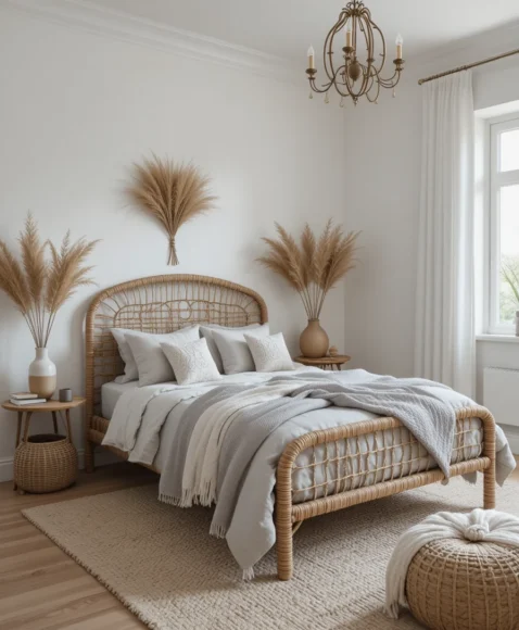 A rattan or wicker bed frame adds natural beauty to a grey boho bedroom. The organic texture of rattan softens the coolness of grey tones and creates a balanced design.