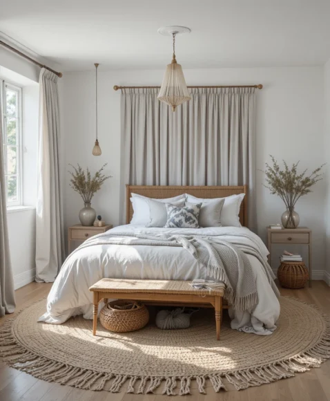 Adding boho textures such as woven rugs, tassel pillows, and linen curtains helps bring warmth into the space while preserving the minimalist elegance of neutral tones.