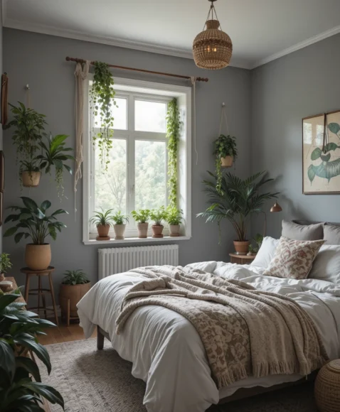 Plants are essential in many bohemian spaces. Hanging plants near windows or above shelves can bring life and freshness into a grey bedroom.