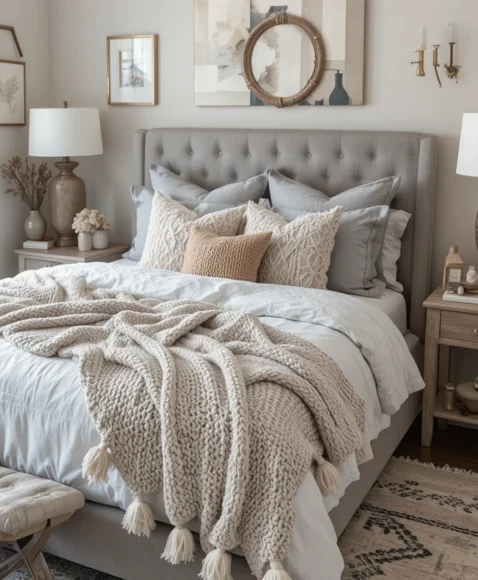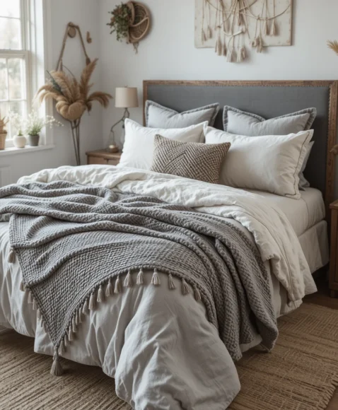 Layering different fabrics is a key part of bohemian bedroom design. Start with soft grey sheets and add textured blankets, knitted throws, and patterned pillows.