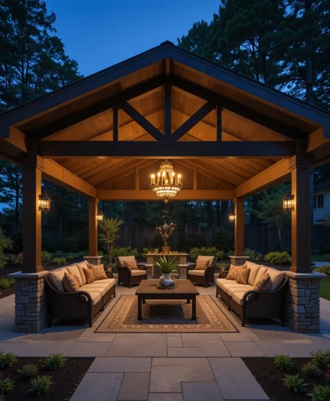 A pavilion structure provides full roof coverage while maintaining an open outdoor feel. It works well for larger patios and creates a comfortable space for dining and entertaining.