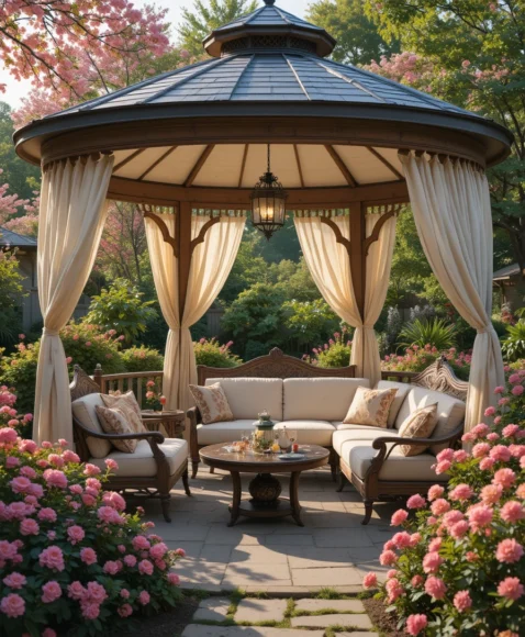 A gazebo structure creates a fully shaded area that feels like an outdoor room. With its roof and open sides, it provides comfort while maintaining airflow and a connection with nature.