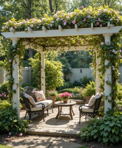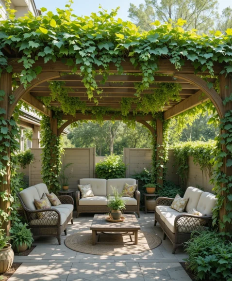 Planting climbing vines on pergolas or trellises creates beautiful natural shade. Plants like ivy, wisteria, or grapevines grow over the structure and form a leafy canopy that cools the space naturally.