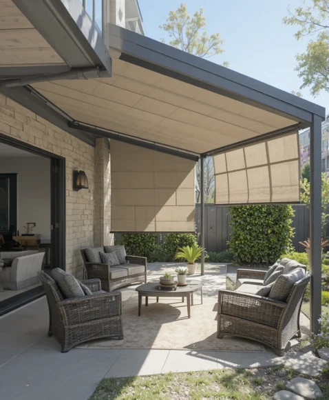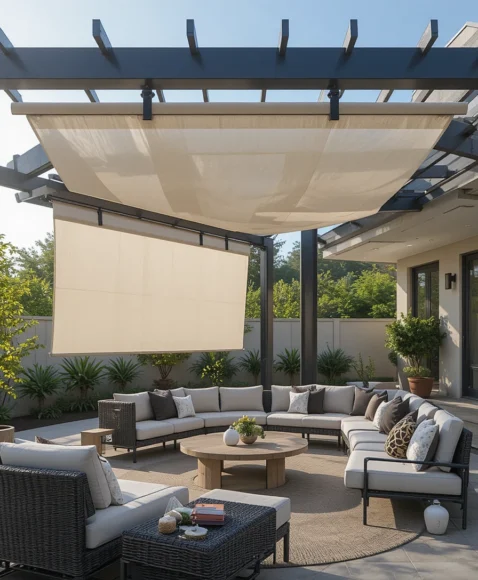 Soft fabric panels stretched across a patio frame create a relaxed and airy shade solution. These panels gently diffuse sunlight while adding movement and texture to the space.
