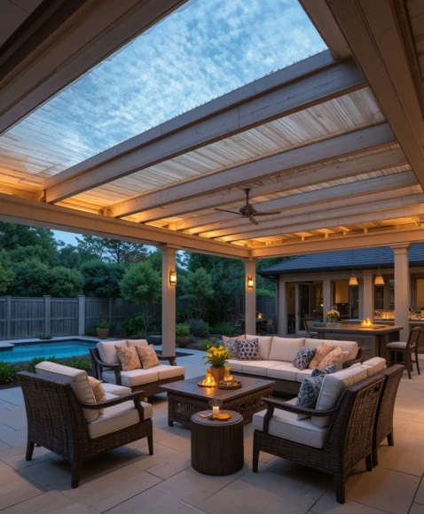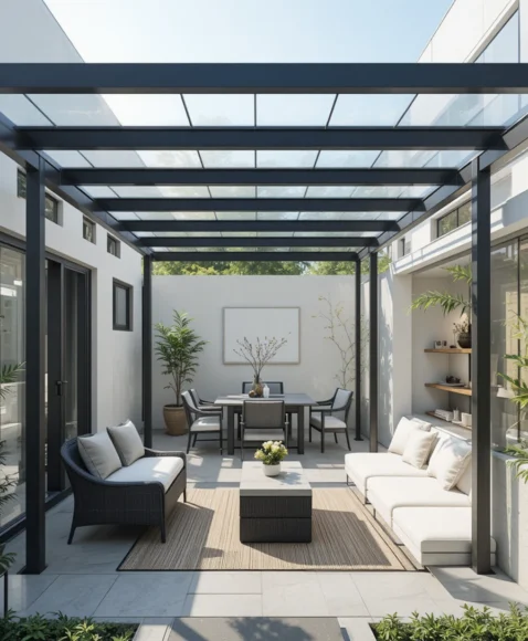Polycarbonate panels allow light to pass through while blocking harsh sunlight and UV rays. A pergola with clear panels offers protection without making the space feel dark.