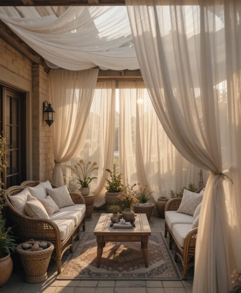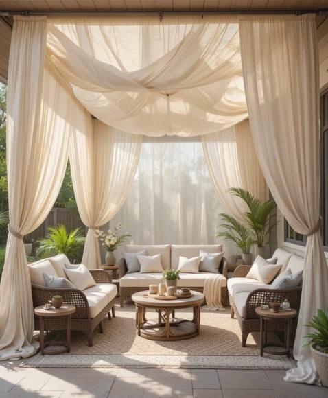 Hanging outdoor curtains around a patio structure creates both shade and privacy. Soft fabric panels block direct sunlight while adding an elegant and relaxed atmosphere to the space.