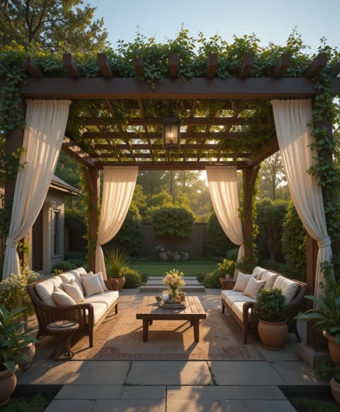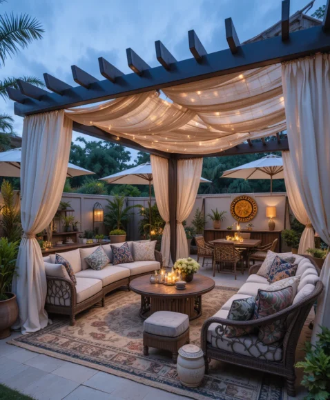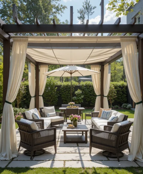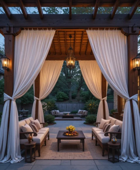 Adding flowing curtains to a pergola enhances both shade and style. The curtains soften the structure and create a cozy, resort-like outdoor environment.