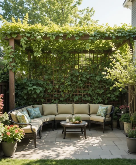 A vertical trellis wall covered with climbing plants can block sunlight from one side of the patio. It also adds greenery and privacy to the outdoor area.
