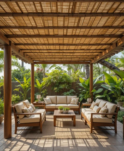 A bamboo shade cover brings a tropical and relaxed feel to the patio. Bamboo panels filter sunlight gently while adding texture and warmth to the outdoor design.