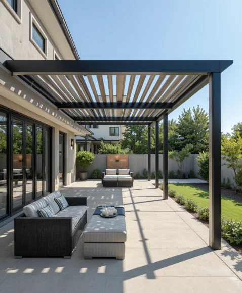 A retractable pergola roof system allows you to open or close the cover depending on weather conditions. This flexible design is perfect for homeowners who want both sunlight and shade.