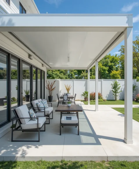 An aluminum patio cover offers durability and a sleek modern appearance. It requires very little maintenance and provides long-lasting protection from sun exposure.