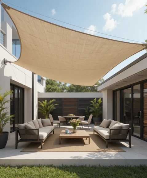 A shade sail is a modern and stylish way to block sunlight. These triangular or rectangular fabric canopies are stretched between posts or walls, creating a sleek design that works especially well in contemporary backyards.